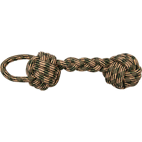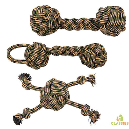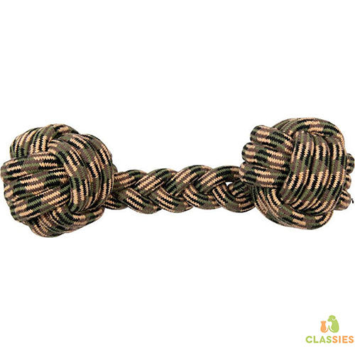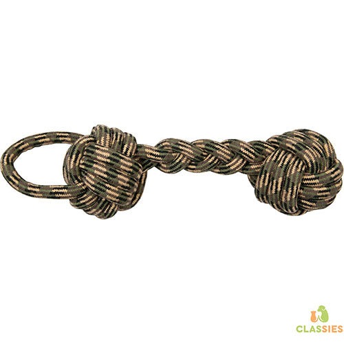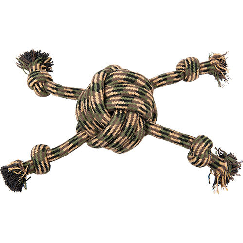 De Jack and Vanilla Sport Camouflage Touwbal met 4 Knopen – Groen/Bruin is een fantastische keuze voor hondeneigenaren die op zoek zijn naar een robuust en stimulerend speeltje voor hun hond. Deze grote touwbal, versierd met vier stevige knopen en uitgevoerd in een stoer camouflagepatroon, is perfect voor honden die houden van intensieve trek- en kauwspellen.