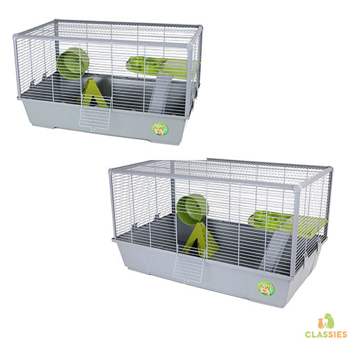 De kooi wordt geleverd met verschillende toebehoren, zoals een plateau, 2 voerbakjes, een molen, een ladder en een metalen tent waar hamsters zich in kunnen verschuilen of verstoppen.