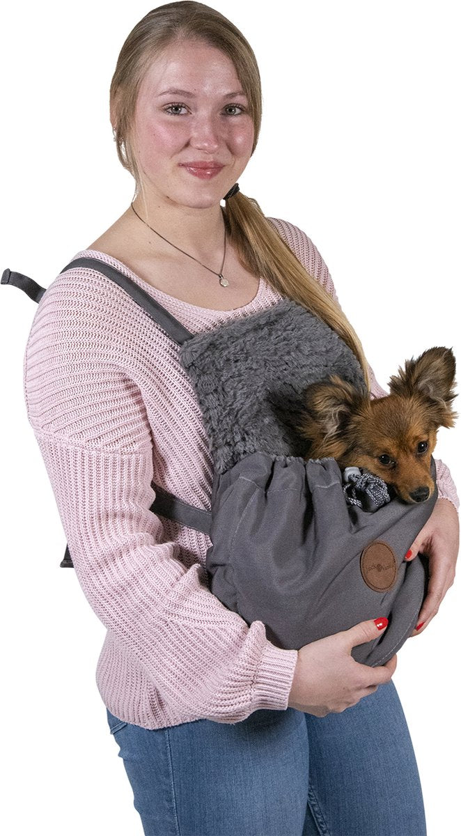 Met deze kangoeroetas draag je je hondje vooraan op de buik, waardoor je hem beter in het oog kan houden en geruststellen. Dankzij de zachte stof binnenin, de stropkoord en het haakje binnenin om je hondje vast te leggen, zit hij veilig en geborgen. De verstelbare taille- en schouderriemen zorgen voor een hoog draagcomfort.
