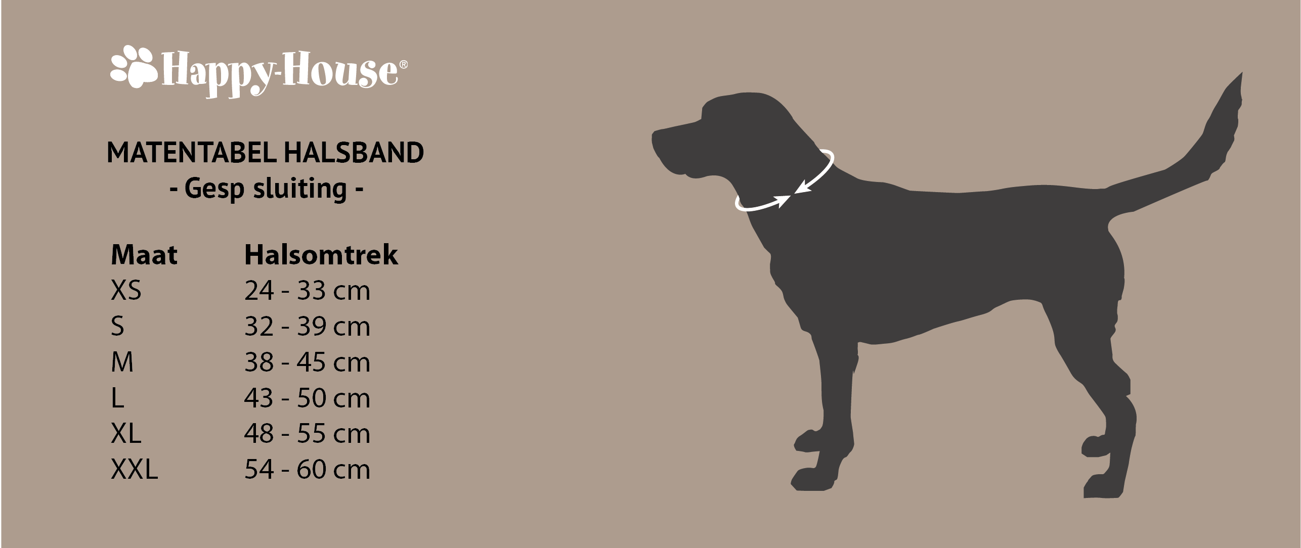 U meet de halsomtrek van uw hond met een meetlint en zorgt dat er zo'n 2 vingers speling tussen het lint en de hals zitten. Dit is de kleinste halsomtrek. Bijvoorbeeld: de halsomtrek van uw hond geeft aan 27 cm, dan is maat XS (25-33 cm) de juiste keuze voor uw hond!