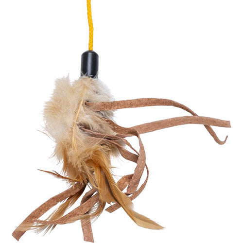 Kattenhengel met leren slierten en veren aan het eind. Trek de aandacht van uw kat door het touw voor zijn neus heen en weer te bewegen en te schudden. Maak onverwachte bewegingen waardoor de kat nog meer zijn aandacht vestigd op leren slierten en veren.