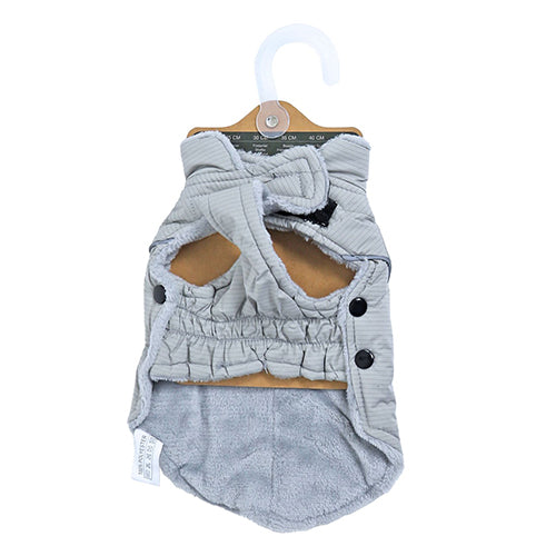 De buitenkant is gemaakt van groen nylon voorzien van een gestikte ruit. Aan de binnenkant is de jas voorzien van zacht fleece. Het openen en sluiten van de winterjas is uitgevoerd met drukknoppen en een klittenbandsluiting op de borst. De rug is voorzien van een ritssluiting, zodat het tuig van uw hond aan kan blijven en bevestigd kan worden aan de hondenlijn.