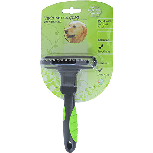 Deze roskam met roterende tanden is uitermate geschikt voor het ontklitten of ontwollen van de vacht.