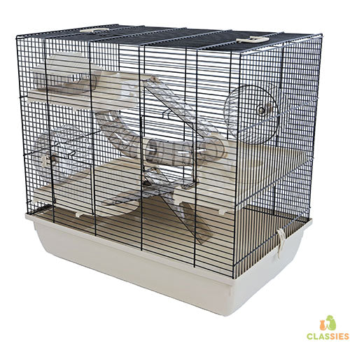 Interzoo hamsterkooi Homer is een rechthoekige kooi met 3 plateaus, zwart traliewerk en een beige onderbak.