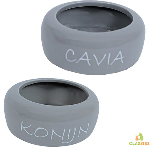 Boon cavia of konijn eetbak aardewerk lichtgrijs met cavia of konijn erop en een doorsnee van 10 - 13 cm, voorzien van een overkappende rand om het morsen tijdens het eten tegen te gaan.