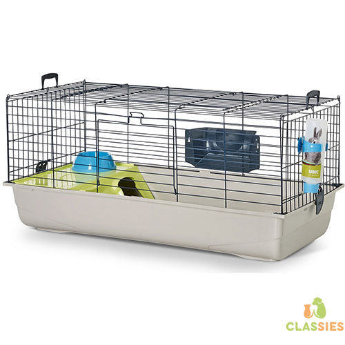 Onder het plateau vindt uw favoriete kleine huisdier een gezellige slaapplaats, terwijl hij op zijn gemak op het plateau kan zitten, eten of liggen. De afneembare bodem maakt het vervangen van het beddengoed in de box snel en eenvoudig. De kooi wordt geleverd met een voerbak, een drinkfles en een hooiruif, waardoor het nieuwe huis van je dwergkonijn meteen kan worden bewoond. De grote toegangsdeuren aan de voor- en bovenkant maken het voeren van de huisdieren en de dagelijkse kooireiniging een fluitje van een cent. De 2 meegeleverde handvatten maken het gemakkelijk om de kooi te verplaatsen.