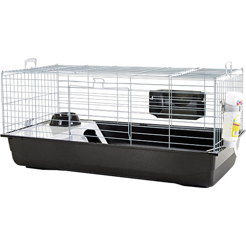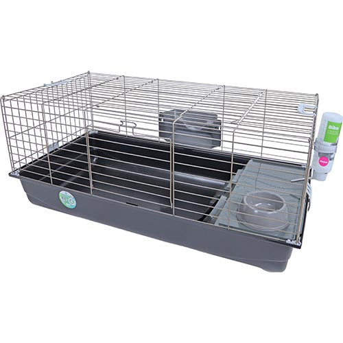 De Savic Nero 3 wordt compleet geleverd met voerbak, drinkfles, plateau en hooiruif.