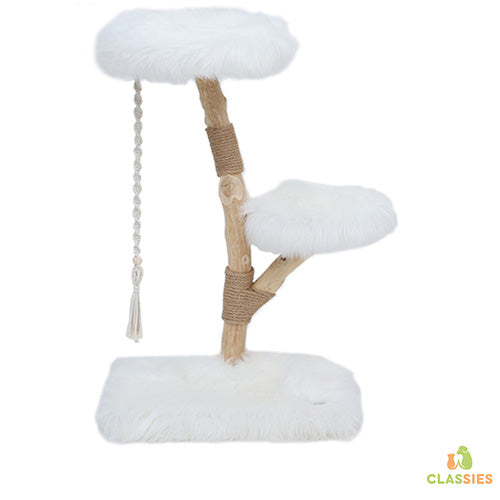 Deze houten klimboom heeft een zware bodemplaat voor extra stabiliteit en twee pluche plateaus die jouw kat kan gebruiken om alles in de gaten te houden of om lekker uit te rusten.