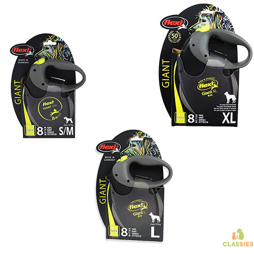 Bij Flexi kan je kiezen tussen lijnen met een koord en lijnen met tape. Het is een persoonlijke voorkeur welke variant je het fijnst vindt. In principe zijn beide soorten even sterk en veilig om te gebruiken. De Giant bevat een tape.