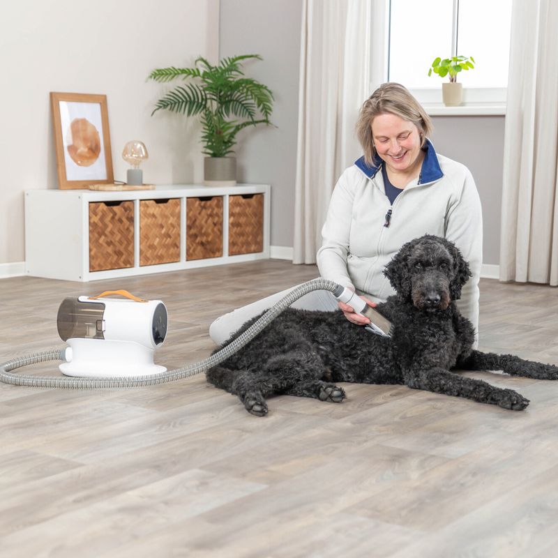 De set beschikt over drie zuigstanden, een 1,5 meter flexibele slang, een HEPA- en schuimfilter en een ruim opvangreservoir van 2 liter – zonder dat je stofzakken nodig hebt. Dankzij de stil lopende motor en aparte aan/uit-schakelaar blijft het trimmen aangenaam voor jou en je hond.