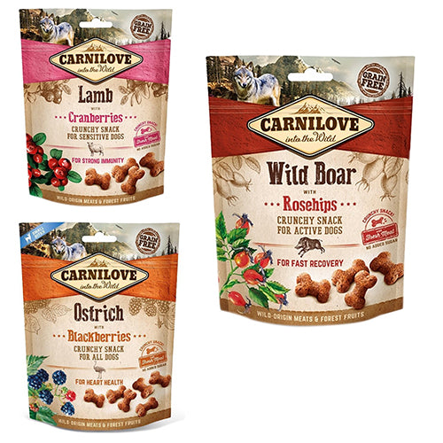 Ontdek de lekkere crunchy snacks van Carnilove in drie smaakvarianten, ontworpen om aan de natuurlijke trek van honden te voldoen — als aanvulling op hun hoofdvoeding. Deze graan- en aardappelvrije traktaties bevatten vers vlees of vis, gecombineerd met bessen, groenten en kruiden, zodat gegarandeerd elke hond smult.