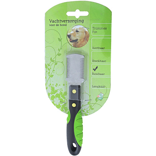 Dit trimmes is geschikt voor het plukken van de vacht. Dit trimmes is geschikt voor alle ruwharige honden. Dit trimmes is door zijn dubbele tanden geschikt voor zowel links- als rechtshandig gebruik. Het regelmatig kammen en borstelen van uw hond draagt er aan bij dat de vacht in topconditie blijft.