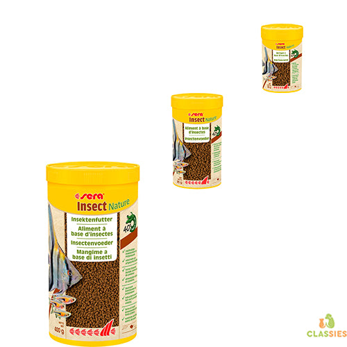 Sera Insect Nature is het hoofdvoeder van duurzaam insectenmeel zonder kleur- en conserveermiddelen en bevat uitsluitend dierlijke proteïnen van insectenmeel. Het langzaam dalende zachte granulaat voldoet aan de natuurlijke voedingsbehoeften van de meeste siervissen. In hun natuurlijke omgeving voeden ze zich voornamelijk met insectenlarven en algen. Naast de Tenebrio-larve – met haar belangrijke proteïnen – zorgen tarwekiemen en andere natuurlijke en hoogwaardige ingrediënten zoals diverse algen voor een gezonde ontwikkeling en vitale vissen.